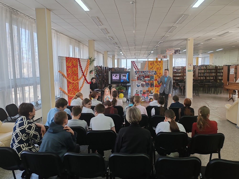 Библиотека им. Н. В. Гоголя тоже не осталась в стороне. В рамках программы «Мы – Россияне!» состоялось интерактивное путешествие по маршруту «Восток» – от первых спутников до легендарных собак-космонавтов. Почётным гостем стал спикер Российского общества «Знание» Евгений Евгеньевич Леонов. Кандидат культурологии, педагог с высшей квалификацией – он говорил со школьниками о звёздах так увлечённо, что, казалось, сам космос заглянул в читальный зал. Ребята разгадывали созвездия, узнавали о развитии ракетостроения и в который раз почувствовали гордость за свою страну.