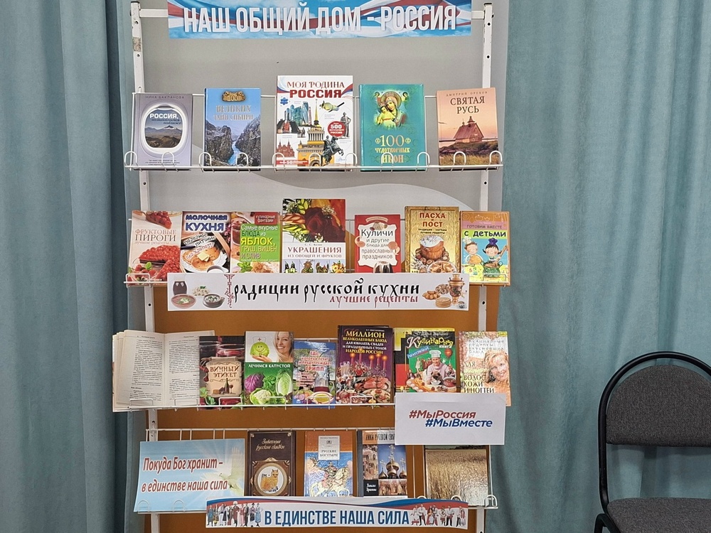 Дополнением к мероприятиям стала книжная выставка «Наш общий дом – Россия». Здесь были представлены книги о традициях русской кухни, а также литература по теме «Покуда Бог хранит – в единстве наша сила».